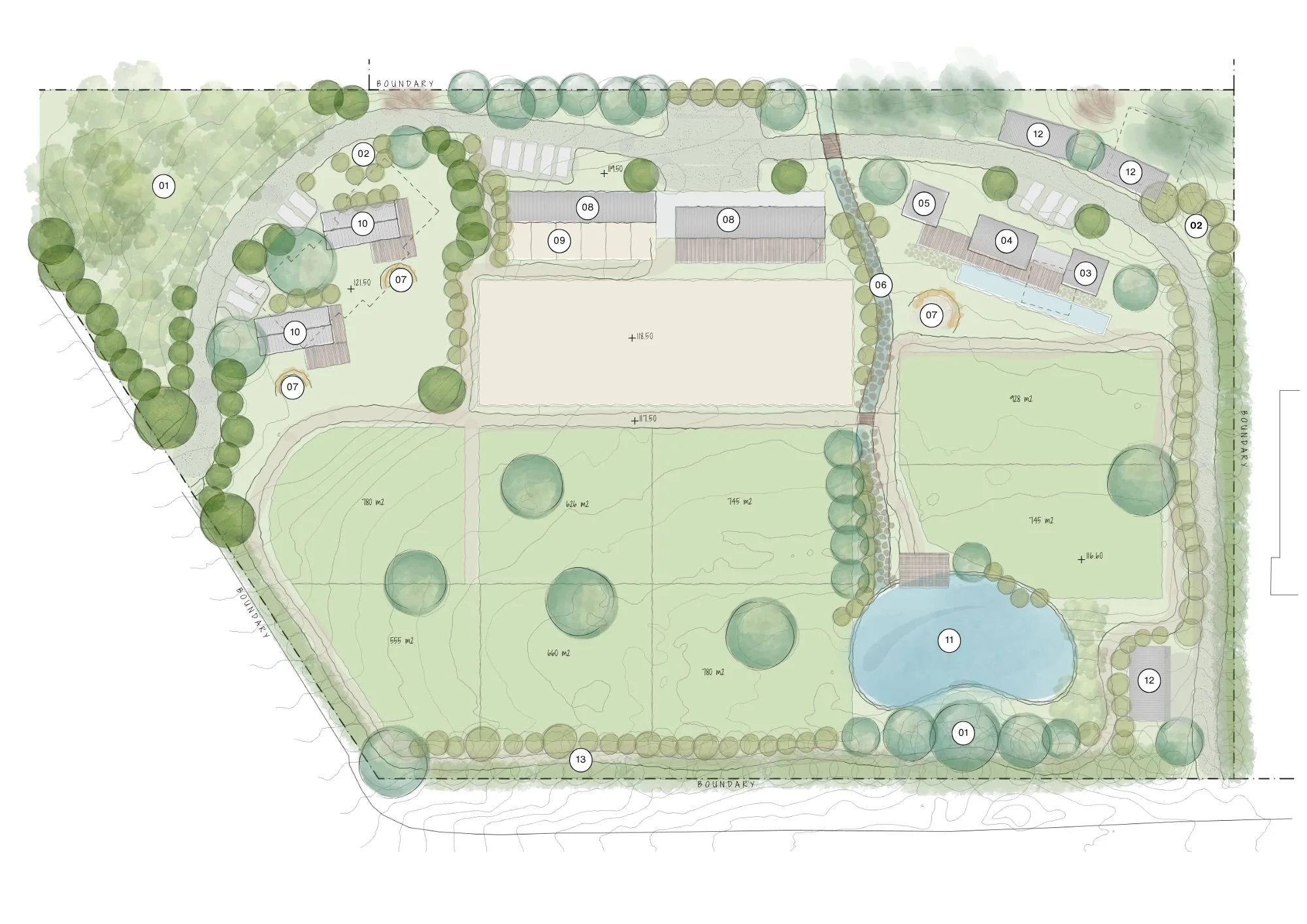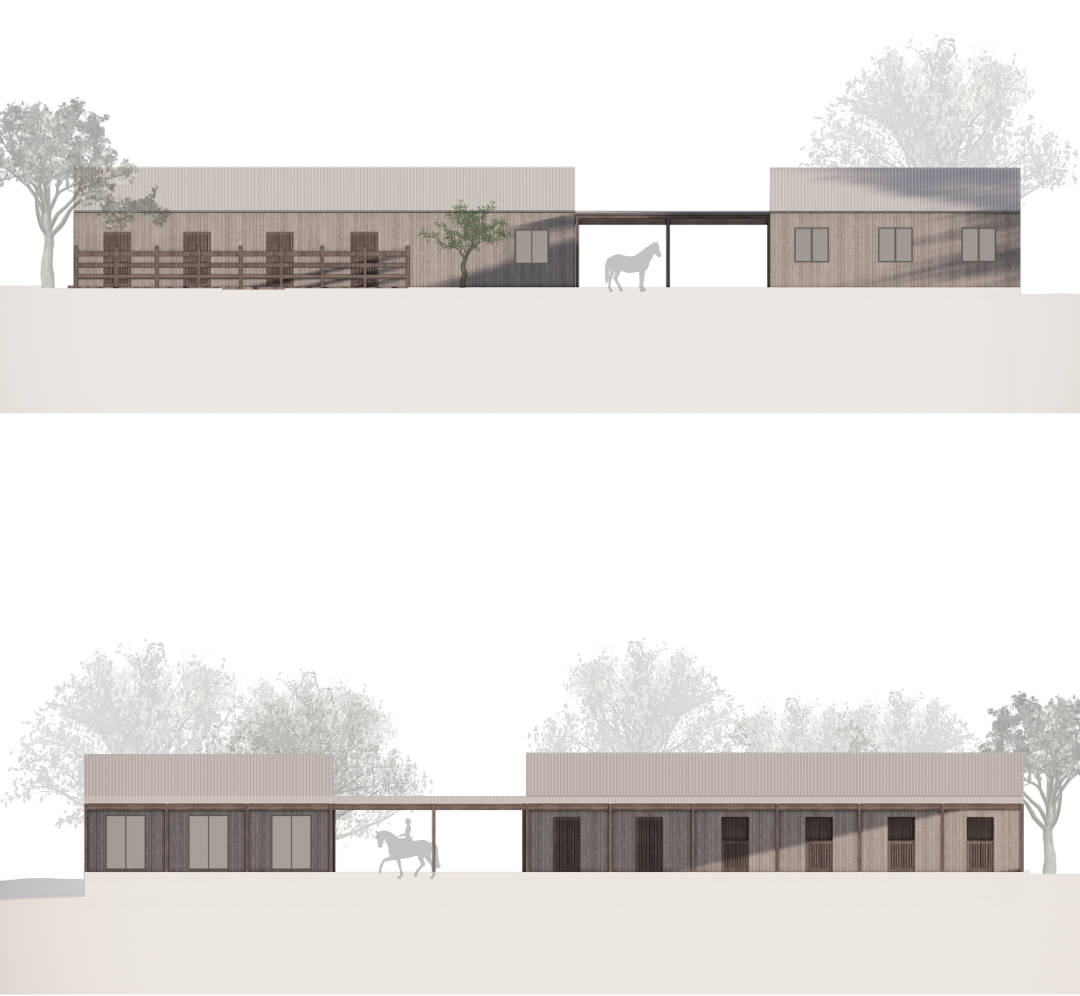 There is no formal hierarchy between the buildings. Stables, sheds, and other outbuildings are expressed through utilitarian forms, reinforcing a sense of authenticity and purpose. The pavilion typology also enhances access to natural light and cross-ventilation, supporting a sustainable, regenerative approach that echoes the broader goals of the landscape design.