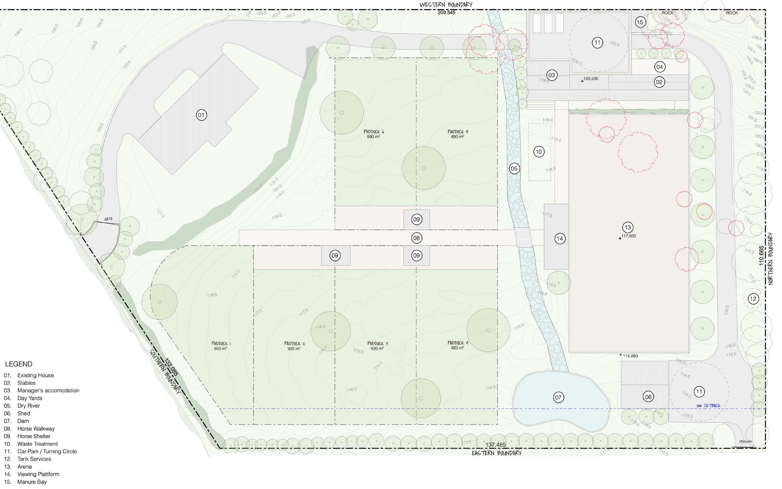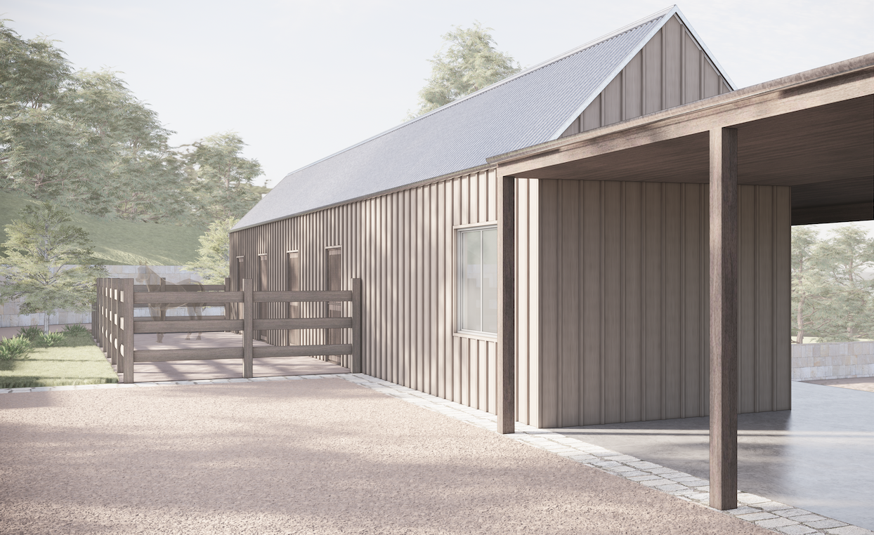 This equestrian property has been conceived as a quiet, responsive intervention in the natural landscape. The design embraces simplicity and flexibility, offering a considered arrangement of spaces that balance everyday function with a refined, understated aesthetic. Each structure draws inspiration from traditional rural sheds, pared-back forms with minimalist detailing that feel timeless and grounded. The pavilion typology enhances access to natural light and cross-ventilation, supporting a sustainable, regenerative approach that echoes the broader goals of the landscape design.